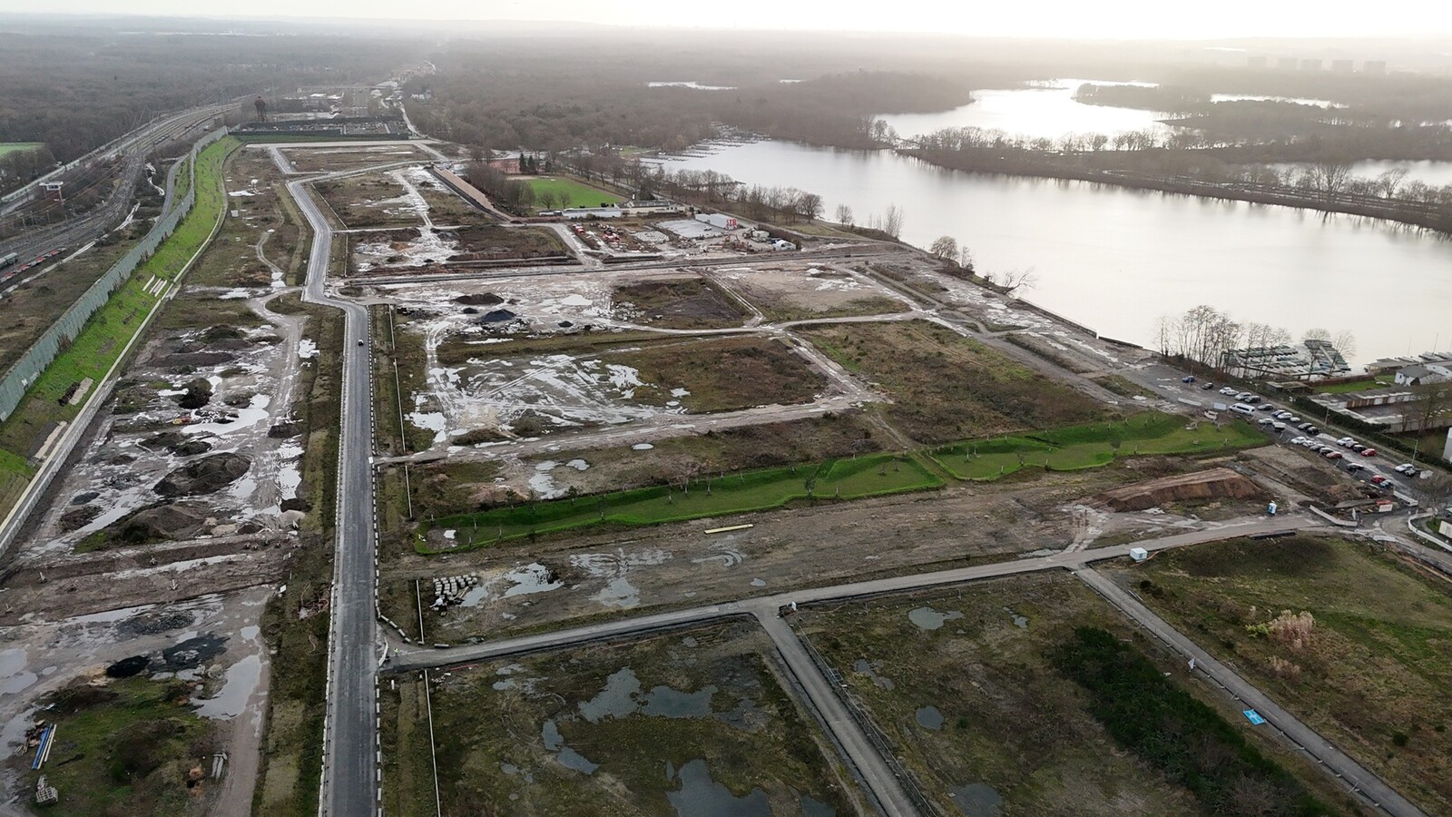 Die Traverse quert das gesamte Planungsgebiet von Ost nach West und trennt das künftige Quartier „Neue Gartenstadt“ und das Seequartier. Es handelt sich um eine 7.500 Quadratmeter große Grünanlage mit Entwässerungsfunktion. „Sie besteht aus drei Wiesenmulden, die das Regenwasser sowohl aus den Straßenanlagen, aus dem Wartungsweg des Lärmschutzwalls als auch aus der Gebäudeentwässerung aus den Investorenbaufeldern aufnimmt, zurückhält und langsam versickern lässt“, erklärt Jens Sperke. Bei Starkregenereignissen besteht zudem die Möglichkeit, das überschüssige Regenwasser über Überläufe an den Masurensee abzuleiten.